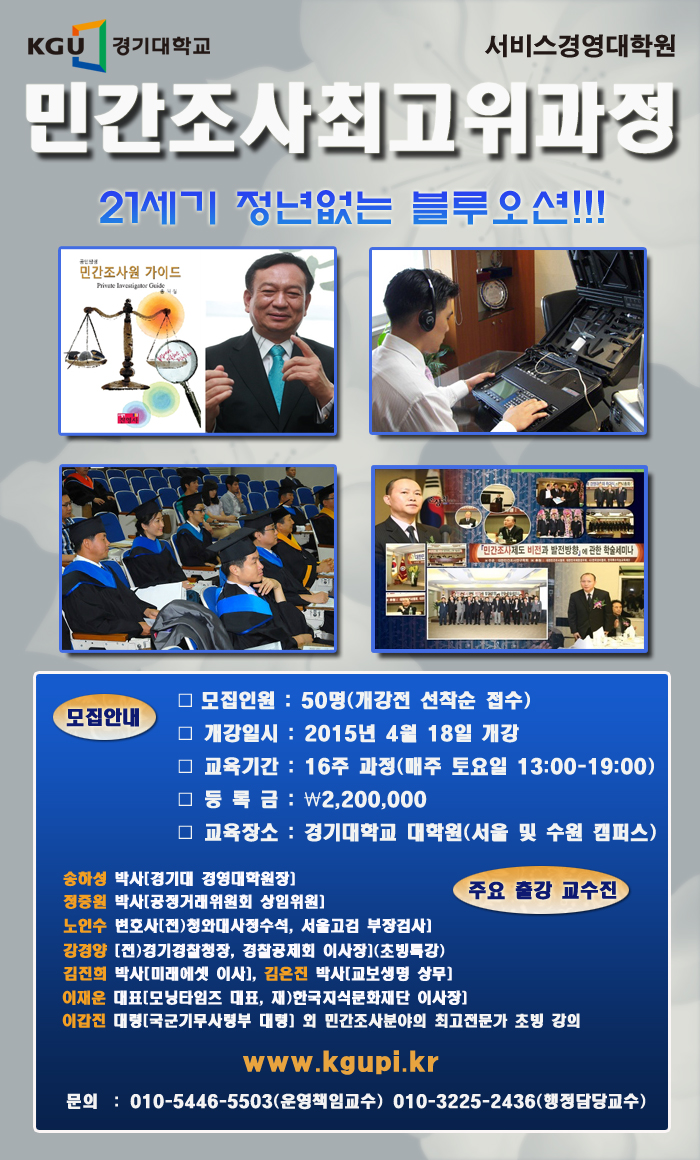 손상철 교수는 “국내 최초로 개설된 경기대학교 서비스경영전문대학원 민간조사전문가 최고위 과정은 기존 민간조사원 교육과정과는 비교할 수 없는 국내 최고의 정상급 교수진이 확보되어 있다는 것이 최대의 강점”이라며 “대학(원)생과 직장인, 민간조사원 국가자격시험 준비생과 민간조사 창업희망자, 군인·경찰·검찰·정보기관·언론사 퇴직자, 공공기관 및 기업체 감사·정보·보안·경비·경호·생활안전 담당자 등을 비롯해 체계적인 민간조사전문가 양성교육을 받기 희망하시는 분, 민간조사업을 통해 인적 네트워킹을 원하시는 분 누구나 지원이 가능하다”고 말했다. 민간조사전문가 교육에 참여하면 교육과정 수료시 경기대학교 총장 명의의 수료증과 민간조사전문가 인증패가 주어지며 경기대 서비스경영전문대학원 진학시 가산점도 부여된다.