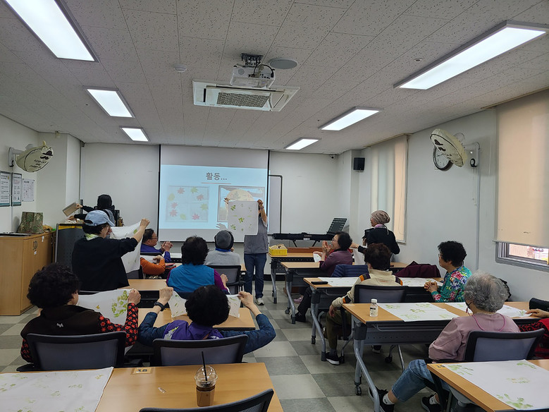 | ▲ 지난해 3월 황송 노인종합복지관에서 탄소중립 교육 중 하나로 봄 식물로 손수건 만들기 활동 진행 중이다 |