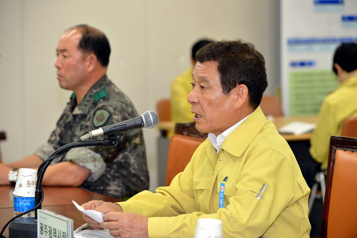 | △ 윤장현(우)이 을지훈련 응소보고 를 받고있다. |