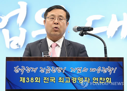 | △ 강연하는 김영배 경총 회장 직무대행 (서울=연합뉴스) 임헌정 기자 = 4일 서울 중구 웨스틴조선 호텔에서 한국경영자총협회(경총) 주최로 열린 제38회 전국 최고경영자 연찬회에서 김영배 경총 회장 직무대행이 강연하고 있다. 2015.2.4 kane@yna.co.kr |