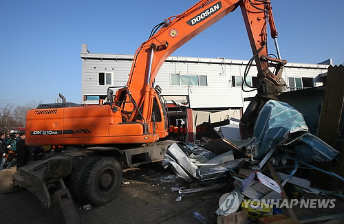 | △ 주민자치회관 철거 (서울=연합뉴스) 한종찬 기자 = 6일 오전 서울 강남구 개포동 구룡마을에서 강남구청 관계자 및 용역 직원들이 주민자치회관 철거작업을 하고 있다. 강남구청은 지난달 5일 건축주에게 가설 건물인 주민 자치회관을 자진해서 철거하도록 시정명령 및 대집행 계고 공문을 발송했다고 밝혔다. 2015.2.6 saba@yna.co.kr |