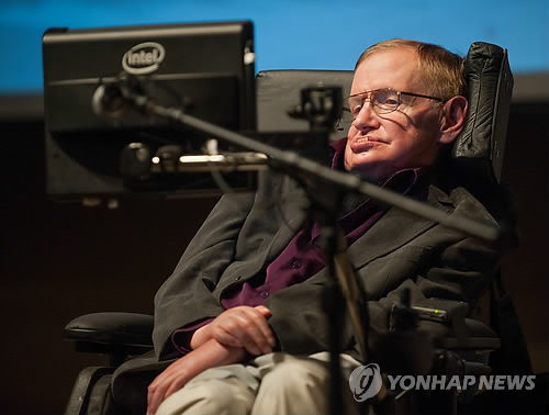 | △ 영국의 세계적 이론물리학자 스티븐 호킹 박사가 미국 로스앤젤레스 세다스-시나이 메디컬센터를 방문, '나의 약력'이란 제목으로 연설하고 있다. 세다스-시나이 메디컬센터는 호킹 박사가 앓고 있는 루 게릭병의 치료를 위한 줄기세포 연구를 하고 있다. |
