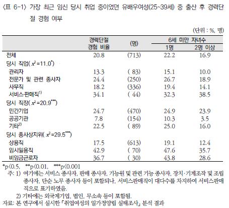 또 임시·일용직(42.9%)이 상용직(17.5%)보다 경력단절을 경험한 비율이 훨씬 높았고. 직업별로는 서비스·판매직(34.1%), 전문가 및 관련 종사자(24.4%), 사무직(18.2%), 관리자(13.3%) 순으로 경력이 단절된 경우가 많았다.