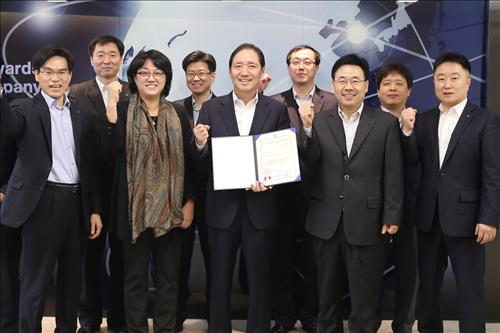 | △ 대우인터내셔널이 공정거래위원회의 공정거래 자율준수 프로그램(CP) 운영 평가에서 최고 등급인 'AA'를 받았다.(왼쪽에서 다섯번째 대우인터내셔널 전병일 사장) |