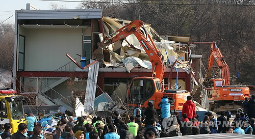 | △ (서울=연합뉴스) 지난 6일 서울 강남구 개포동 구룡마을에서 구청 및 용역업체 직원들이 주민자치회관을 철거하고 있다. 구청은 이날 오전 9시부터 본격적으로 철거를 시작했지만, 법원의 철거 중단 결정에 따라 10시 20분께 철수했다. |