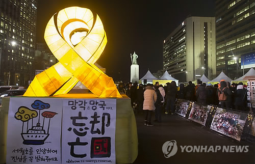 | △ '세월호 참사 300일 문화제' (서울=연합뉴스) 윤동진 기자 = 9일 오후 서울 광화문광장에서 열린 '세월호 참사 300일 진상규명 촉구 문화제'에서 참가자들이 촛불을 든 채 세월호의 조속한 인양과 철저한 진상규명을 촉구하고 있다. |