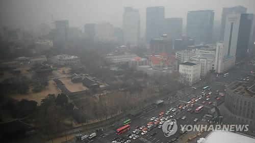 | △ '오늘도 미세먼지 주의하세요' (서울=연합뉴스) 박지호 기자 = 서울의 미세먼지 농도가 '나쁨' 수준을 기록한 11일 오전 서울 중구 소공동의 한 건물에서 바라본 서울 도심이 뿌옇게 보이고 있다. |