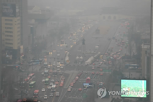 | △ '오늘도 미세먼지 주의하세요' (서울=연합뉴스) 박지호 기자 = 서울의 미세먼지 농도가 '나쁨' 수준을 기록한 11일 오전 서울 중구 소공동의 한 건물에서 바라본 서울 도심이 뿌옇게 보이고 있다. |