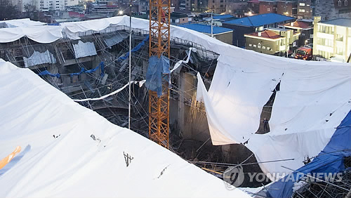 | △ 사당종합체육관 사고 현장 (서울=연합뉴스) 윤동진 기자 = 11일 오후 서울 동작구 사당동 사당종합체육관 신축공사장 매몰 현장에서 소방대원들이 구조활동을 벌이고 있다. |