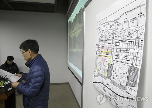 | △ 사육사 김 모 씨가 사자에 물려 숨진 사건이 발생한 12일 오후 서울 광진구 어린이대공원 회의실에서 안찬 어린이대공원장이 사고현장 도면을 붙여 놓은 채 브리핑을 하고 있다. |