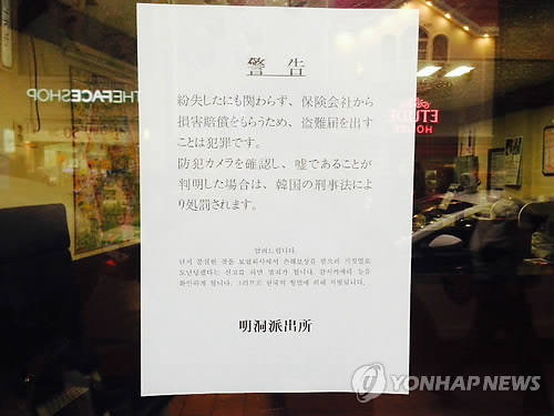 명동파출소 '거짓 도난신고는 처벌' 일본어 경고문 부착