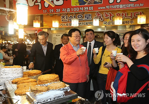 | △ 이동필 농림축산식품부 장관(가운데)이 서울 종로구 광장시장을 방문, 빈대떡집에서 중국관광객과 함께 막걸리를 마시며 막걸리의 다양성과 우수성을 홍보하고 있다.(연합뉴스 자료사진). |