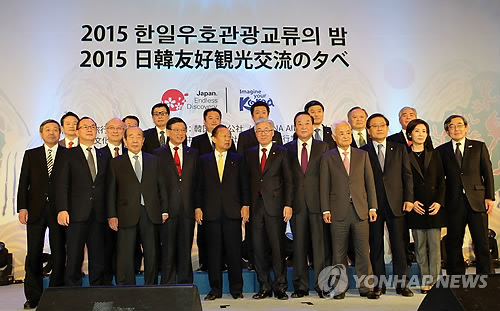 | △ '한일우호 관광교류의 밤' (서울=연합뉴스) 14일 서울 송파구 롯데호텔에서 열린 '2015 한일우호 관광교류의 밤' 행사에서 김종덕 문화체육관광부 장관, 박삼구 금호아시아나그룹 회장, 니카이 도시히로 일본전국여행업협회 회장 등 한국과 일본의 주요 참석자들이 한일 교류를 기념하는 박을 터트린 뒤 기념촬영을 하고 있다. 이번 행사는 지난해 2월 박 회장과 일본전국여행업협회장인 니카이 의원이 한일 국교 정상화 50주년을 기념해 2015년에 한일 우호관계 증진을 위한 교류 행사를 한국에서 개최하기로 뜻을 모아 성사됐다. 2015.2.15 photo@yna.co.kr |