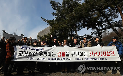 | △ 긴급조치9호피해자모임과 민청학련계승사업회 등 과거사 관련 단체 관계자들이 지난 1월 20일 오전 서울 서초구 서울중앙지검 앞에서 기자회견을 열고 검찰의 과거사위원회 활동 인권변호사에 대한 수사를 멈출 것을 촉구하고 있다. |