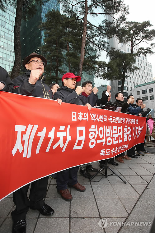 이들은 이날 서울 종로구 일본대사관 앞에서 기자회견을 열어 "시마네현이 주관하는 다케시마의 날 행사를 저지할 것"이라며 "광복 70주년과 한일국교 정상화 50주년을 맞는 의미 있는 해에 아베정권의 군국주의 부활 움직임을 규탄한다"고 밝혔다.