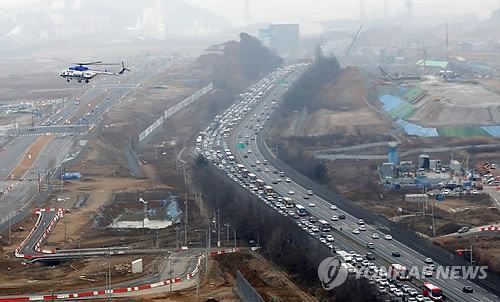 | △ 귀성길 (화성=연합뉴스) 윤동진 기자 = 설 연휴를 하루 앞둔 17일 오후 경찰청 귀성길 점검 헬기에서 바라본 경기 화성시 동탄 신도시 부근 경부고속도로 |