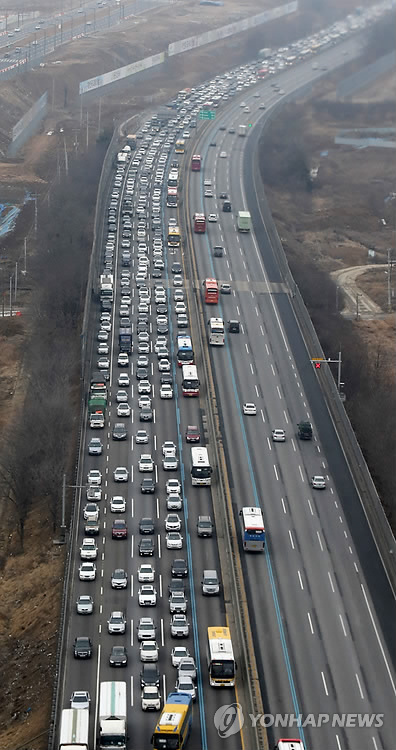(서울=연합뉴스) 이도연 기자 = 설 연휴 첫날인 18일 새벽부터 쏟아져 나온 귀성행렬로 인한 고속도로 정체가 오후까지 계속되고 있다.