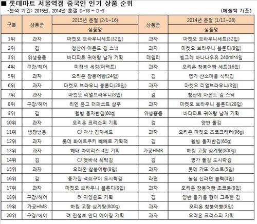 22일 롯데마트에 따르면 춘제 연휴 직전 12일(5~16일)동안 중국인이 많이 찾은 롯데마트 서울역점의 유커 매출을 분석한 결과, 작년 같은 기간(춘제 기준)보다 31%나 늘었다.