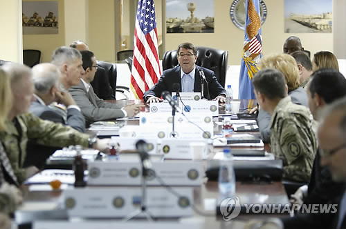 카터 국방장관은 이날 쿠웨이트의 아리프잔 미군 기지에서 로이드 오스틴 미군 중부사령관과 존 앨런 대통령 특사를 비롯해 유럽과 아프리카 지역 미군 사령관들과 아랍국 주재 미국 대사들까지 약 25명을 소집, 6시간에 걸쳐 비공개회의를 주재했다.