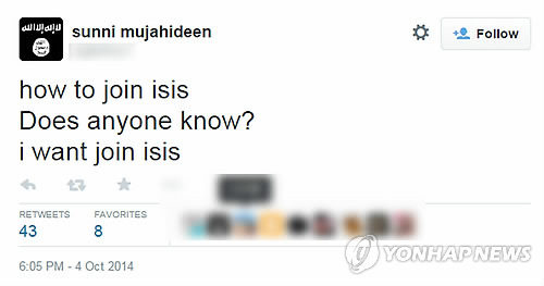 | △ 'IS' 합류 방법 묻는 터키 실종 김군의 트위터 맨션 (서울=연합뉴스) 터키의 시리아 접경지에서 실종된 김모군이 사용한 트위터 계정의 모습. 'sunni mujahideen'이라는 이름을 사용한 이 트위터에서 김군은 이슬람국가(IS) 합류 방법 묻는 질문을 남겼다. 김군 실종 사건을 수사 중인 서울지방경찰청 국제범죄수사대는 20일 김군이 'glot****'라는 트위터 계정을 사용한 것으로 확인했다. 2015.1.20 << 트위터 >> photo@yna.co.kr |