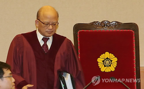 | △ 입장하는 박한철 헌법재판소장 (서울=연합뉴스) 임헌정 기자 = 박한철 헌법재판소장이 간통죄 위헌 여부 선고를 위해 26일 오후 서울 종로구 재동 헌법재판소 대심판정으로 들어서고 있다. 헌재는 이날 간통을 처벌하도록 한 형법 제241조가 위헌이라고 선고했다. 헌법재판관 9명 중 7명이 위헌 의견을 내놨다. 2015.2.26 kane@yna.co.kr |