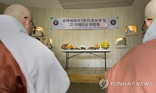 (서울=연합뉴스) 윤보람 기자 = '송파 세모녀' 사건이 발생한 지 1주기를 맞아 이들의 넋을 기리고 사건 재발 방지를 촉구하는 위령제가 27일 열렸다.