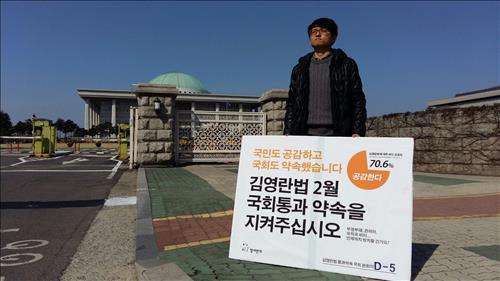 참여연대는 27일 오후 1시께 국회 정문 앞에서 '김영란법 2월 국회 통과 약속을 지켜주십시오'라고 적힌 팻말을 들고 1인 시위를 시작했다.