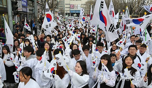 청년단체 '청년하다' 회원 40여명은 이날 오후 1시부터 혜화역 인근에서 유관순과 김구 복장을 하고 '대한독립만세'를 외치는 플래시몹을 했다.