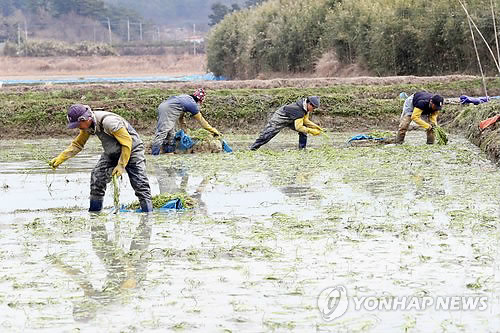 | △ 외국인 근로자들이 미나리를 수확하고 있다. (연합뉴스 자료사진) |