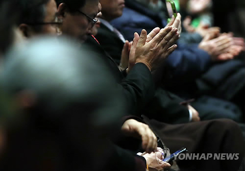 | △ 파독 근로자들의 손 (서울=연합뉴스) 이지은 기자 = 26일 오후 서울 중구 태평로 프레스센터에서 열린 파독 51주년 기념 감사 송년회에서 파독근로자들이 내빈들의 감사 인사말에 박수를 치고 있다. 2014.12.26 jieunlee@yna.co.kr |