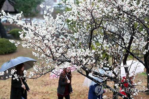 | △ 봄비 내리는 캠퍼스 (부산=연합뉴스) 조정호 기자 = 비가 내린 3일 부산시 남구 동명대학교에서 학생들이 우산을 쓰고 꽃망울을 활짝 터뜨린 매화 나무 옆을 걸어가고 있다. |