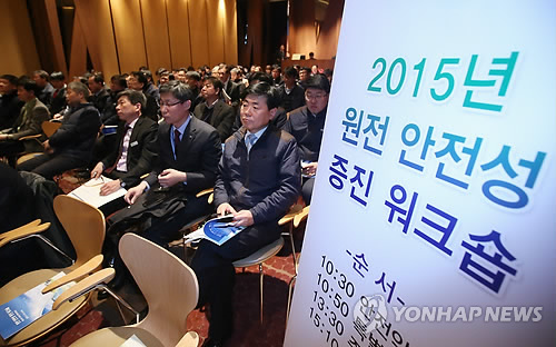 | △ 2015 원전 안전성 증진 워크숍 (서울=연합뉴스) 임헌정 기자 = 4일 서울 삼성동 한국수력원자력에서 열린 2015년 원전 안전성 증진 워크숍에서 참석자들이 동영상을 시청하고 있다. |