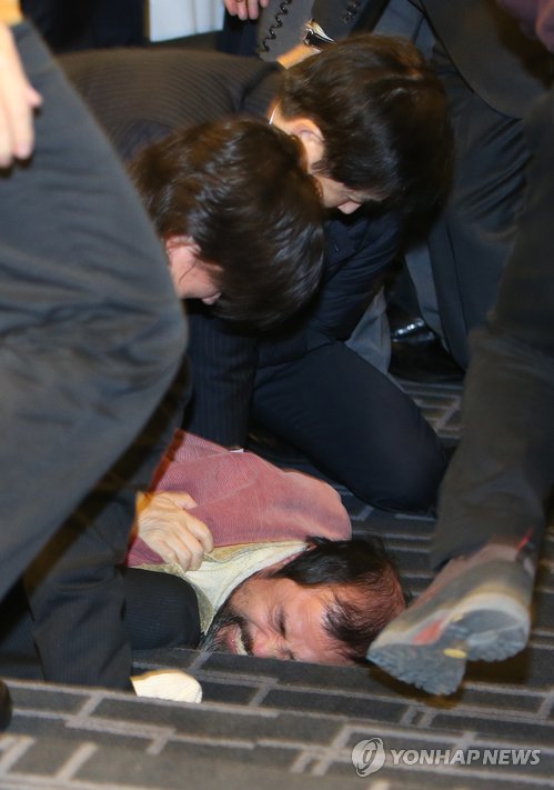 | △ 제압당하는 리퍼트 미 대사 습격 괴한 (서울=연합뉴스) 김주성 기자 = 5일 오전 서울 세종문화회관에서 열린 민화협 주최 초청 강연에서 마크 리퍼트 주한 미국대사를 습격한 용의자가 새누리당 장윤석 의원 등 참석자들에게 제압당하고 있다. |