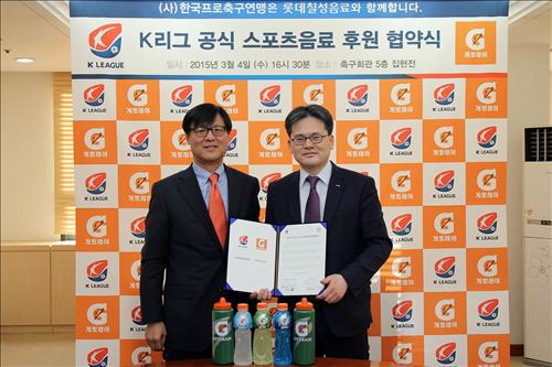 (서울=연합뉴스) 김아람 기자 = 롯데칠성음료는 프로축구 K리그와 2015∼2016년 2년간 공식 음료 후원 협약을 맺었다고 5일 밝혔다.