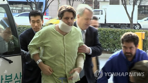 | △ 신촌 세브란스병원 들어가는 마크 리퍼트 대사 (서울=연합뉴스) 5일 오전 흉기 습격을 당한 마크 리퍼트 주한 미국 대사가 서울 서대문구 신촌세브란스 병원으로 들어가고 있다. 2015.3.5 << 연합뉴스TV >> photo@yna.co.kr |