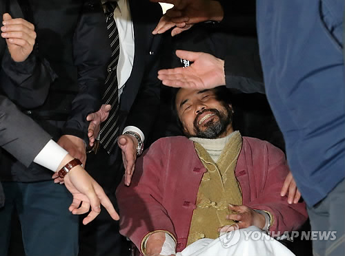 | △ 법원 도착한 김기종 (서울=연합뉴스) 최재구 기자 = 마크 리퍼트 주한 미국대사를 습격한 김기종이 살인미수와 외교사절폭행·업무방해 혐의로 영장실질심사를 받기 위해 6일 오후 서울 서초구 서울중앙지법으로 들어서고 있다. |