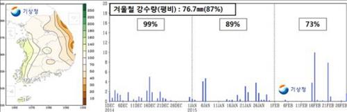8일 기상청에 따르면 겨울철(작년 12월∼올해 2월) 전국 평균 강수량은 76.7㎜로, 평년 평균인 88.5㎜의 86.7% 수준이다.