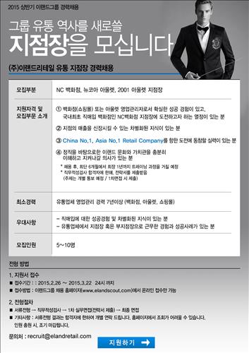 채용 지원서 접수는 오는 22일까지 홈페이지(www.elandscout.com)에서 한다. 서류전형 합격자를 대상으로 직무적성 검사와 면접을 한다.