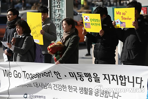 | △ 리퍼트 대사 퇴원 축하 기자회견 (서울=연합뉴스) 박동주 기자 = 10일 오후 서울 미국대사관 인근에서 열린 '리퍼트 대사 퇴원 축하 기자회견'에서 한국대학생포럼의 한 관계자가 발언하고 있다. |