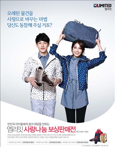 (서울=연합뉴스) 전준상 기자 = 아웃도어 브랜드 엠리밋은 제3세계 아이들에게 꿈과 희망을 주기 위해 22일까지 모든 매장에서 '사랑나눔 보상판매전'을 진행한다고 12일 밝혔다.