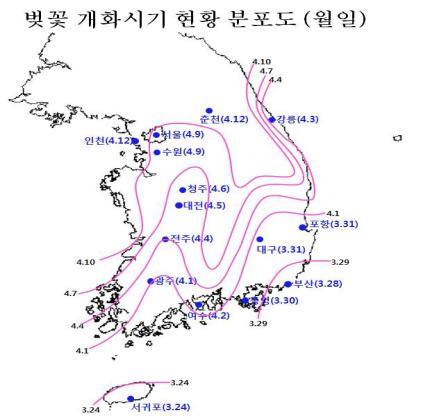 지역별로 보면 24일 서귀포를 시작으로 남부지방은 3월 28일∼4월 4일, 중부지방은 4월 3∼12일, 경기 북부와 강원 북부·산간지방은 4월 12일 이후에 개화할 것으로 전망된다.