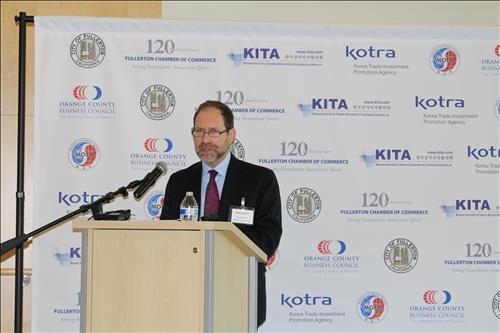 | △ 허쉬 대표보가 12일(현지시간) LA총영사관 주최로 열린 `한미 FTA 발효 3주년 기념 콘퍼런스'에 참석해 기조연설을 하고 있다. |