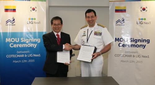 LIG넥스원은 12일(현지시간) 콜롬비아 카르타헤나에 위치한 코텍마르사(社)에서 콜롬비아 에르난도 윌스 발레스 해군사령관, 호르헤 까레뇨 모레노 코텍마르 사장과 콜롬비아 연안경비정 사업을 위한 업무협약(MOU)을 체결했다.