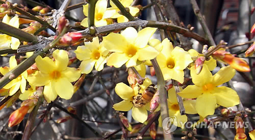 | △ 봄 기운 전하는 영춘화 (청주=연합뉴스) 김형우 기자 = 8일 오후 청주 도심 주택가에 봄을 알리는 전령사로도 알려진 영춘화가 수줍게 꽃망울을 드러냈다. 2015.3.8 vodcast@yna.co.kr |