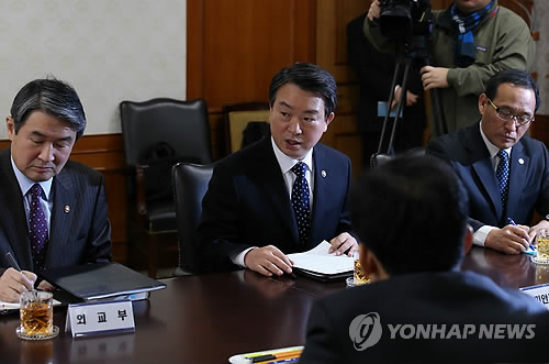 | △ 리퍼트 대사 피습 긴급 차관회의 (서울=연합뉴스) 전수영 기자 = 강신명 경찰청장이 5일 오전 서울 세종로 정부서울청사에서 열린 마크 리퍼트 주한 미국대사 피습 사건 관련 긴급 차관회의에서 추경호 국무조정실장 등 참석자들에게 사건를 보고하고 있다. 2015.3.5 swimer@yna.co.kr |