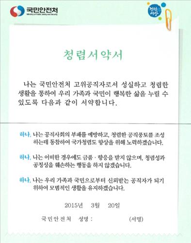(서울=연합뉴스) 이정현 기자 = 국민안전처는 고위공직자에게 '청렴서약서'를 작성하게 한 후 배우자 등 그 가족에게 우편으로 발송한다고 19일 밝혔다.