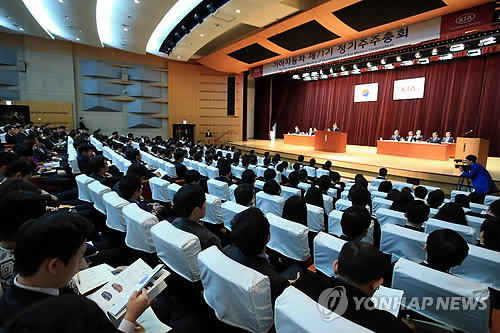 | △ 기아차 71기 정기 주주총회 개최 (서울=연합뉴스) 홍해인 기자 = 20일 오전 서울 양재동 기아자동차 사옥에서 기아자동차 제71기 정기 주주총회가 열리고 있다. |
