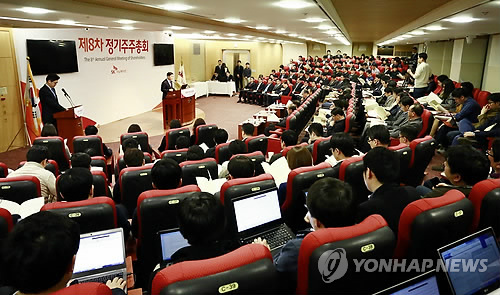 | △ SK이노베이션 제8차 정기주주총회 개최 (서울=연합뉴스) 성혜미 기자 = SK이노베이션이 20일 제8차 정기주주총회를 개최했다. SK이노베이션은 2014년 영업손실 2천312억원을 기록했다는 내용 등의 재무제표 내역을 승인받고, 적자경영에 따라 34년만에 처음으로 무배당을 결정했다. 2015.3.20 << SK이노베이션 제공 >> noanoa@yna.co.kr |
