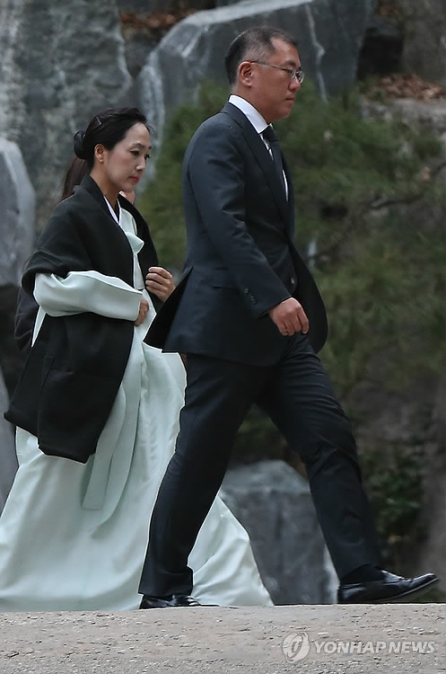 | △ 고 정주영 회장 14주기 참석한 정의선 부회장 (서울=연합뉴스) 이지은 기자 = 정의선 현대차 부회장이 20일 오후 정주영 전 현대그룹 명예회장의 14주기 제사가 치러지는 정 전 명예회장 생전 청운동 자택으로 가족과 함께 들어가고 있다. |