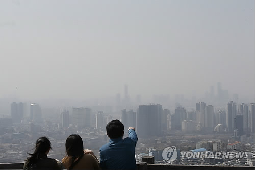 | △ '봄 불청객' 황사 (서울=연합뉴스) 이상학 기자 = 내몽골과 중국 북서부에서 발원한 황사의 영향으로 전국 대부분 지역에 옅은 황사가 나타난 22일 남산을 찾은 시민들이 서울 상공을 바라보고 있다. |